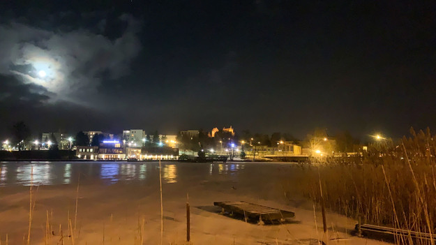 Iława jest maleńkim miasteczkiem i wszystkie atrakcje oblecimy w dwie godziny, no może trzy jak pójdziesz na lody, albo na kawę nad brzegiem zadbanego portu. Jest ładny kościół, brzydka starówka, budzący uśmiech KinoTeatr i ciekawy park miejski z rzeźbami Czterech Pór Roku, zagrabionymi z Pałacu w Kamieńcu. Koniec. Ja na szybkości trzasnąłem kilka nocnych zdjęć z marszu, mijając miasto i już ciemną porą wkraczając na szlak.