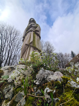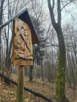 Testując przyczepność moich podeszw na świeżym błotku podejścia kontemplowałem kolejne stacje męczeństwa Jezusa. Nie jestem dramatycznie kościołowy - bliżej mi do naturalizmu i Leszego - ale ludowym sznytem ciosane płaskorzeźby obrazujące ostatnią drogę na Golgotę przemawiały do wyobraźni. Na szczycie znajduje się wielki krzyż, a jeszcze wyżej powiewa flaga polska. Szlak wije się między skałami a potem łagodnie opada pomiędzy drzewa okolicznego lasu. Pogoda wciąż jest wymagająca - padająca krupa tasuje się z deszczem oraz ostrymi przebłyskami słońca jak karty w rękach doświadczonego krupiera - wręcz zszokowany jestem, że nie udało się zobaczyć tęczy.