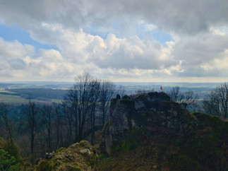 Finalnie ruszyłem dupę i chwacko zarzucając plecak na garba ruszyłem raźno - wbrew przeciwnościom - na spotkanie kolejnych wrażeń. Grodzisko Pańskie i Skałki Zegarowe już zwiedzałem ostatnimi laty. Obydwa stanowią genialne punkty widokowe oraz obfitują w ciekawe formy skalne i jaskinie. Dobre miejsce na dziki nocleg. Na Grodzisku jest też lokalna kalwaria leśna i właśnie w niedzielę - praktycznie w ciągu kilku godzin - miała się tam odbyć droga krzyżowa. Poczekałbym, żeby poobserwować jak ludziska radzić sobie będą na stromym i śliskim podejściu, ale rozkład jazdy wzywał - przed zmrokiem musiałem być z powrotem pod ruinami w Ogrodzieńcu (a raczej w Podzamczu, heh!)
